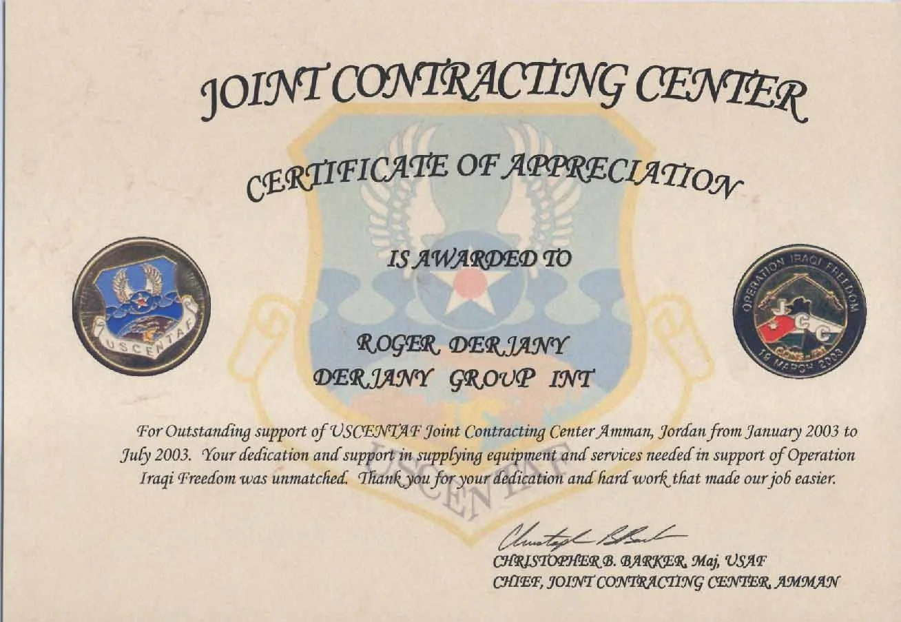 Awarded to Roger Derjany for dedication and hard work supplying equipment for Operation Iraqi Freedom.