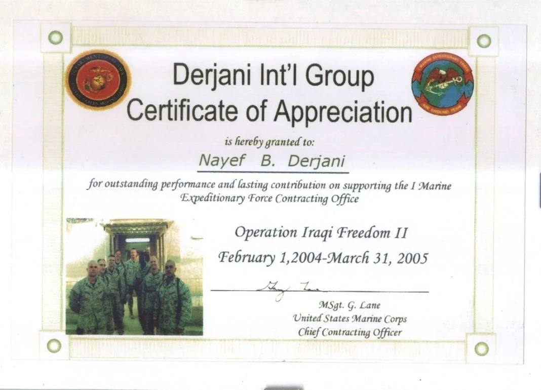 Awarded to Nayef B. Derjani for outstanding performance supporting the 1st Marine Expeditionary Force.