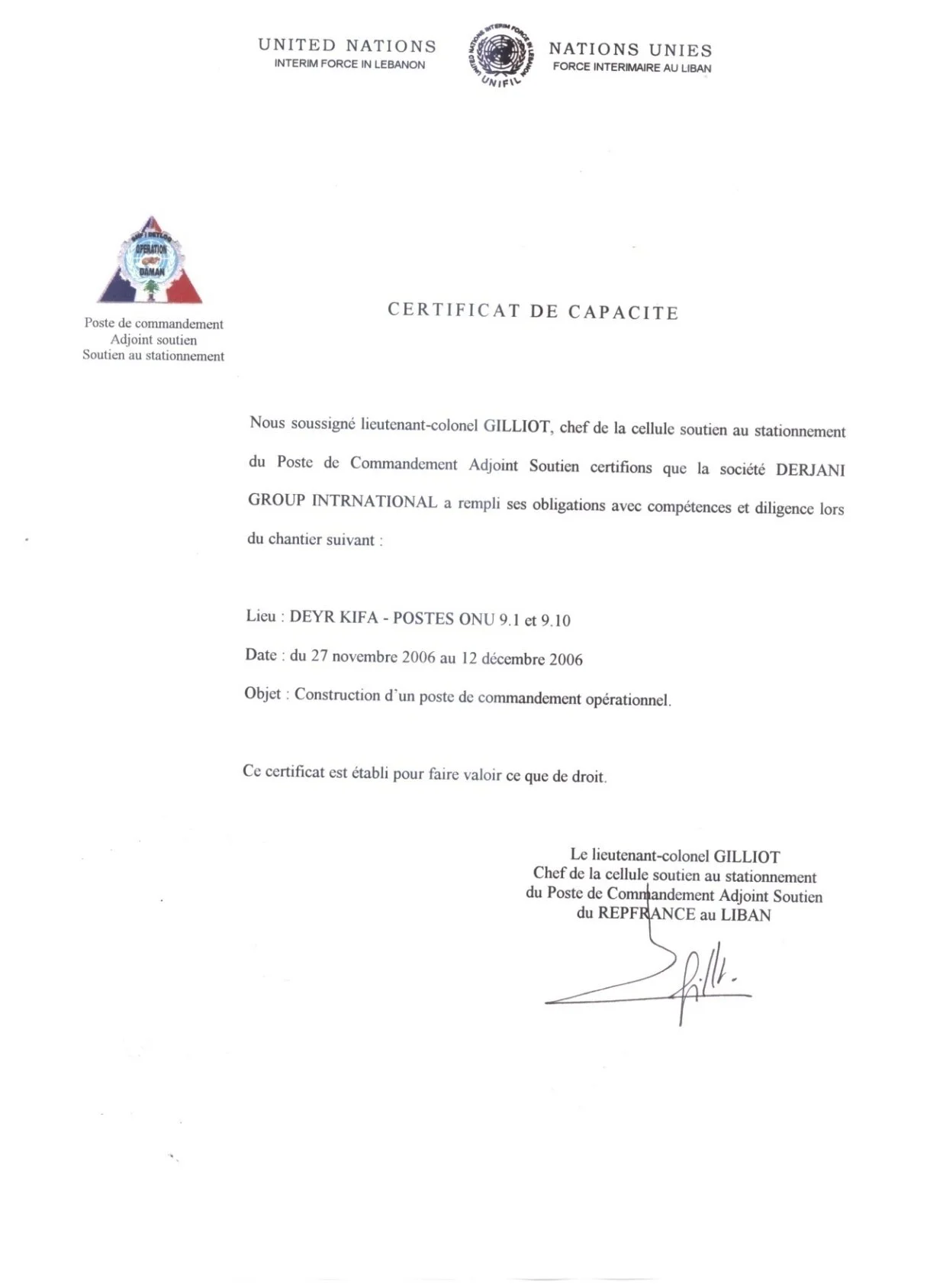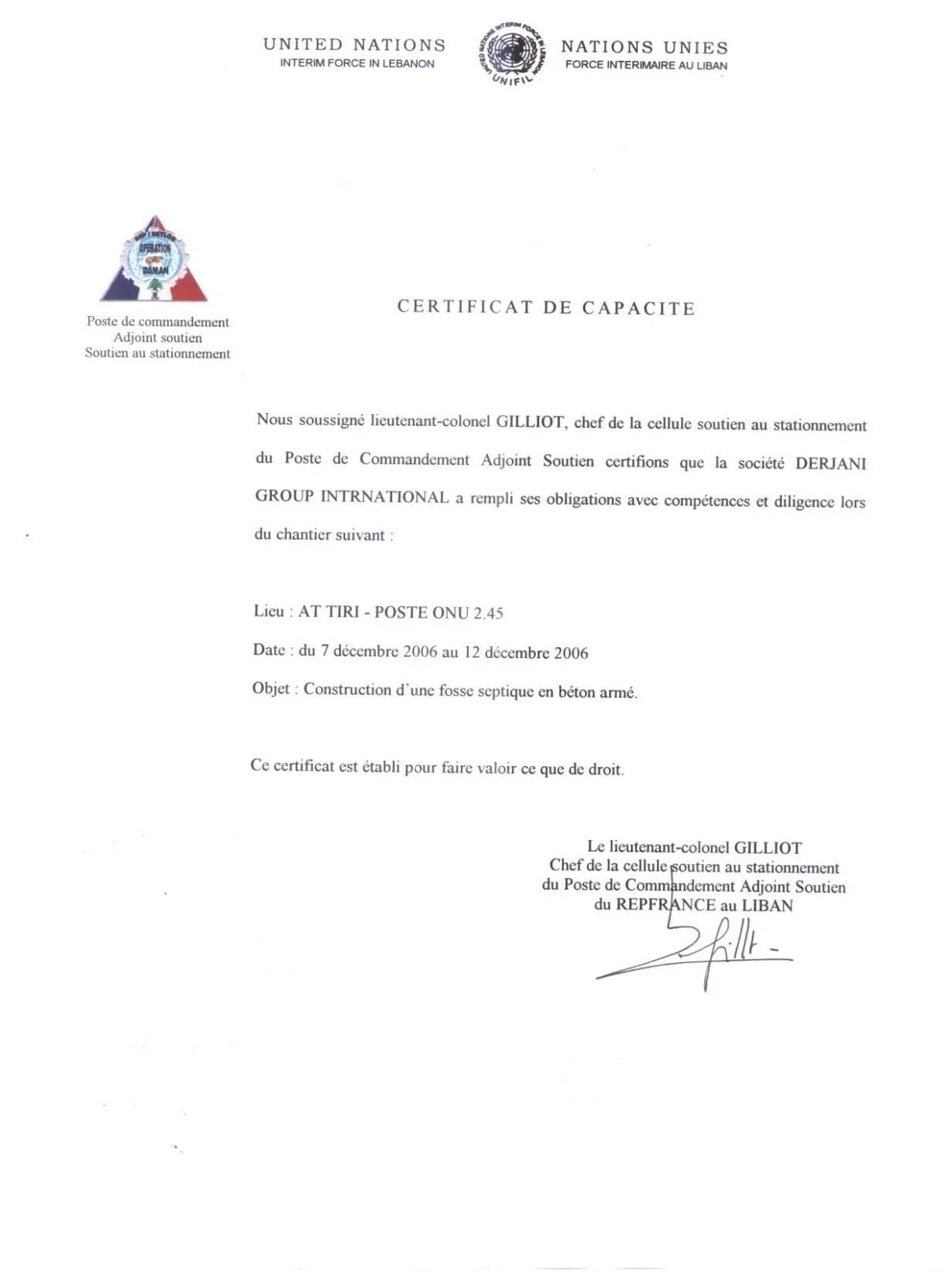 Official "Certificats de Capacité" (Completion Certificates) issued by the French Ministry of Defense and United Nations (UNIFIL).